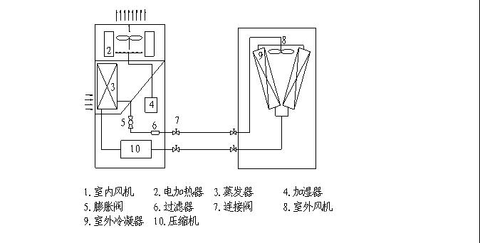 室外側(cè)翅片換熱器作為蒸發(fā)器,室內(nèi)側(cè)翅片換熱器作為冷凝器,壓縮機(jī)排出的制冷劑高溫氣體在室內(nèi)側(cè)翅片換熱器冷凝成液體后經(jīng)膨脹閥節(jié)流降壓成為低溫氣體混合體,再流入室外側(cè)翅片換熱器吸收熱量蒸發(fā)后回到壓縮機(jī),完成一個(gè)制冷循環(huán);同時(shí),從室內(nèi)來的回風(fēng)(或新風(fēng))經(jīng)過室內(nèi)側(cè)翅片換熱器(這時(shí)為冷凝器)后則被加熱升溫,處理后的熱風(fēng)由室內(nèi)側(cè)風(fēng)機(jī)再送入室內(nèi)。