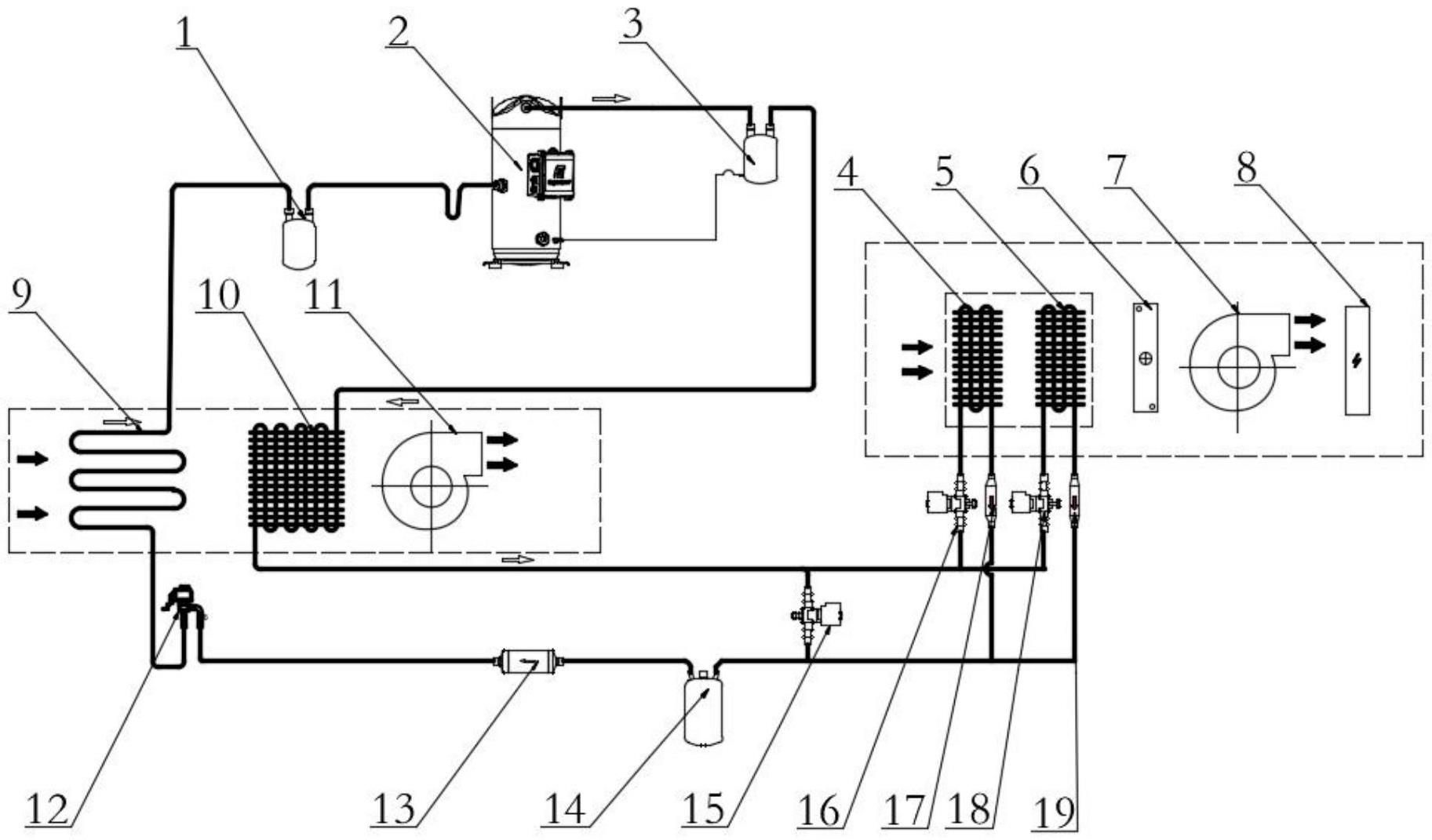 一種節(jié)能型高溫烘干除濕機(jī),申請(qǐng)?zhí)柣驅(qū)@?hào):202410975186.6,本發(fā)明涉及除濕機(jī)技術(shù)領(lǐng)域,尤其涉及一種節(jié)能型高溫烘干除濕機(jī)。其技術(shù)方案包括:高溫烘干房和固定安裝于高溫烘干房一側(cè)的除濕房,還包括:設(shè)于除濕房內(nèi)的第一風(fēng)道和第二風(fēng)道,制冷循環(huán)系統(tǒng),所述制冷循環(huán)系統(tǒng)安裝于第一風(fēng)道和第二風(fēng)道內(nèi),冷凝器控制系統(tǒng),所述冷凝器控制系統(tǒng)安裝于第一風(fēng)道和第二風(fēng)道內(nèi)。本發(fā)明可以完全利用第一冷凝器和第二冷凝器以及第三冷凝器內(nèi)的熱量,并且不需要經(jīng)過排濕過程損失大量熱量同時(shí)也降低了效率,節(jié)能高效;通過控制第二冷凝器和第三冷凝器的啟閉狀態(tài),能夠?qū)崿F(xiàn)多級(jí)變化不僅可以適應(yīng)寬范圍烘干溫度,而且在各溫度下均能穩(wěn)定安全運(yùn)行。