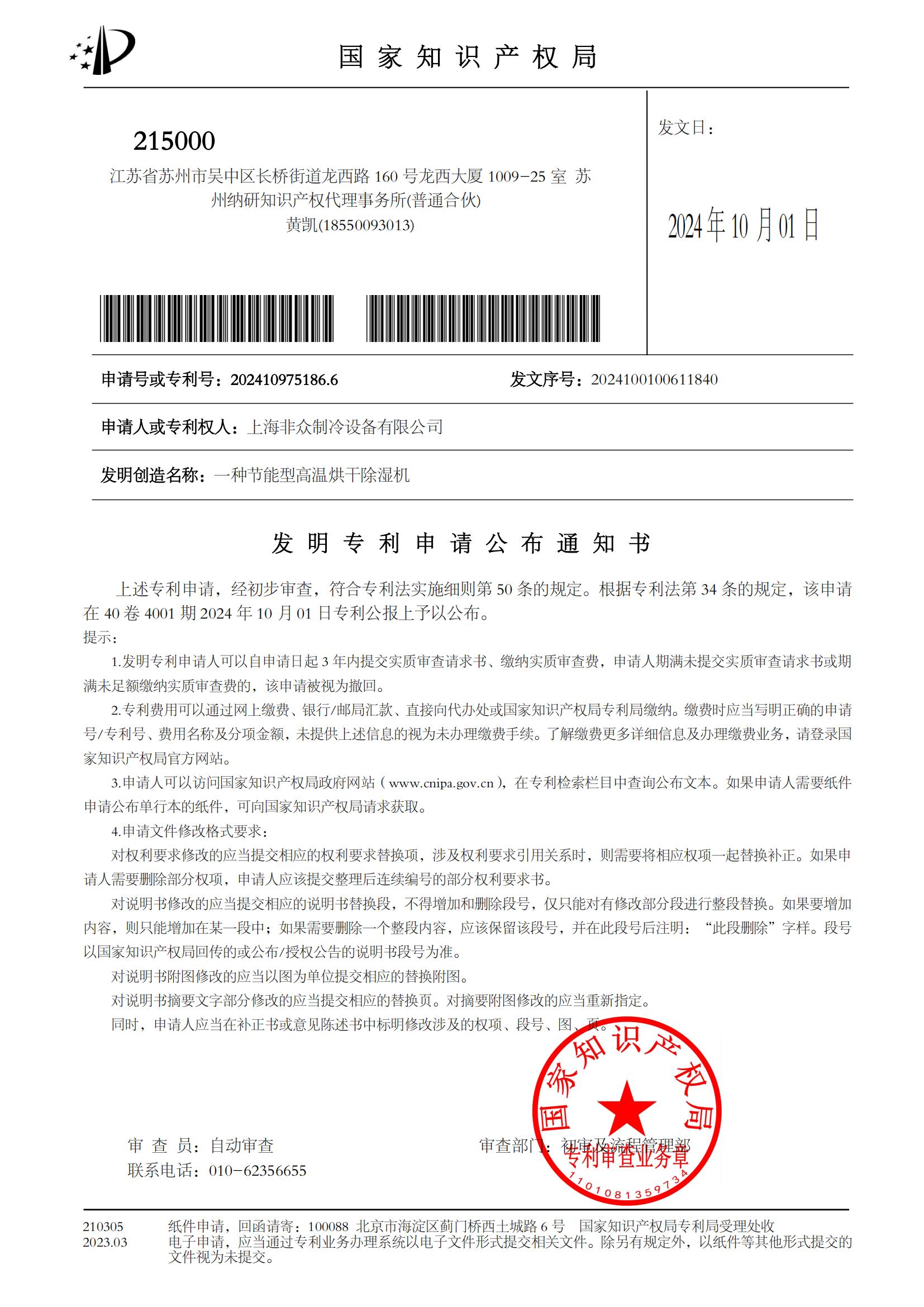 熱烈祝賀上海非眾制冷“一體式的屋頂空調(diào)機(jī),專利號(hào):ZL 2024 2 0258431.7”實(shí)用新型專利獲得國家知識(shí)產(chǎn)權(quán)局授權(quán),取得專利證書并申請(qǐng)公布發(fā)明專利“ 一種節(jié)能型高溫烘干除濕機(jī),申請(qǐng)?zhí)柣驅(qū)@?hào):202410975186.6 ”